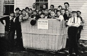 The entertainment options were also impressive. On Thursday morning, a long procession of Milford schoolchildren marched past a huge illuminated arch and through the Oval as flags flew and the Milford Laurel Band played. Spectators proceeded to Endicott Park to watch the big game. At 11:00 an alarm went off signaling a “fire,” and three companies raced to McLane’s where they soaked the factory with streams of water just to show what they could do. Perhaps most spectacular of all was the “largest basket in the world” created just for the carnival by the Hawkins Manufacturing Company. Nearly two dozen men and boys crowded inside as a photographer snapped the photo below.