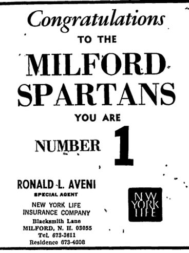 Compiling an 18-2 regular season record, the Spartans headed into the playoff tournament in high gear. After seeing their local boys trounce Berlin in the quarterfinals, Milford fans braved a March evening snowstorm to drive up to Durham to see the Spartans beat Nashua 80 to 66 in the semis.