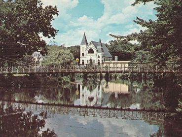 But what about that name? Bridge bouncing might give the old ladies a fright, but swinging? Turns out the name comes from some precarious predecessors. The original swing bridge went up about 1850 and crossed the Souhegan a little downriver. Never a sturdy affair, it had some serious swinging moments — in fact, during an icy 1857 storm, a woman was swept off the bridge and drowned. That original bridge was taken down and its replacement, in the vicinity of the current bridge, was washed away in a storm. Today’s 200-foot iron suspension bridge, with its durable steel cables and nearly three-story-tall uprights, was constructed in 1889 by the Berlin Iron Bridge Company of Connecticut for $3500. The firm gave it both beauty and brawn – the Victorian-era ironwork complete with finials and lattice girders speaks to the ornamental era in which it was built. Since then, a century and more of mill workers, joggers, dog-walkers, and deep thinkers have enjoyed the lovely view towards St. Patrick’s in one direction and towards the McLane Dam in the other.